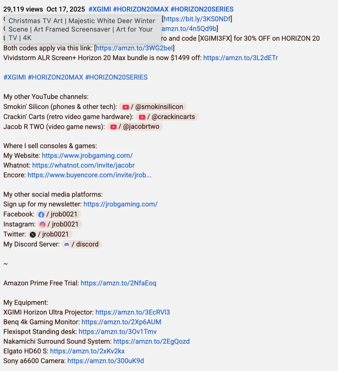 更关键的是,Jacob R 在视频描述中清晰放置了 Amazon 与官方购买短链,并标注了折扣和联盟信息,把“看完就能买”这条路径彻底打通。