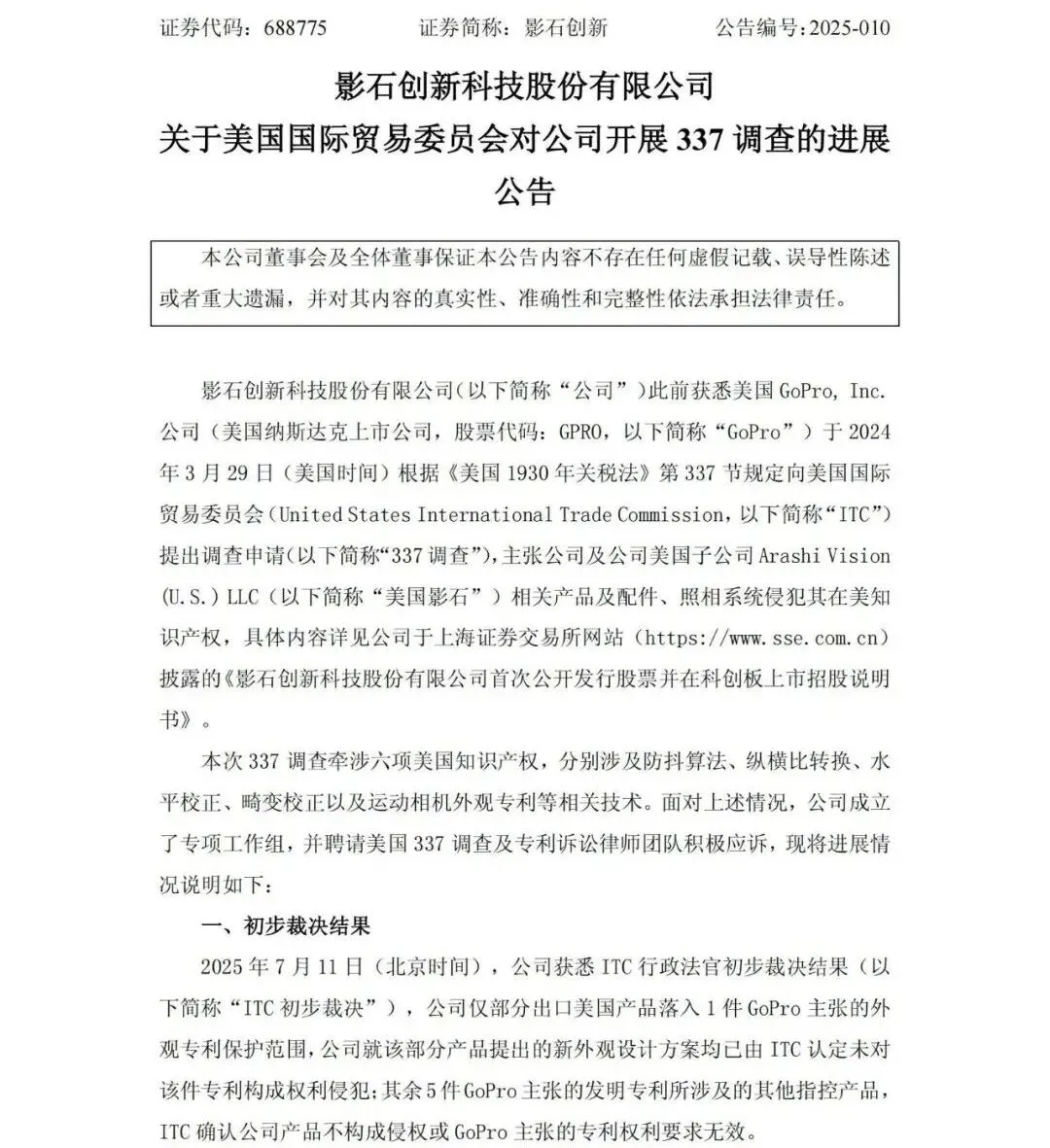 2025年7月,ITC给出初步裁决,结果已经对影石十分有利:影石只有部分老产品涉及1项外观专利,新设计并不侵权,其余5项发明专利的指控全部不成立;