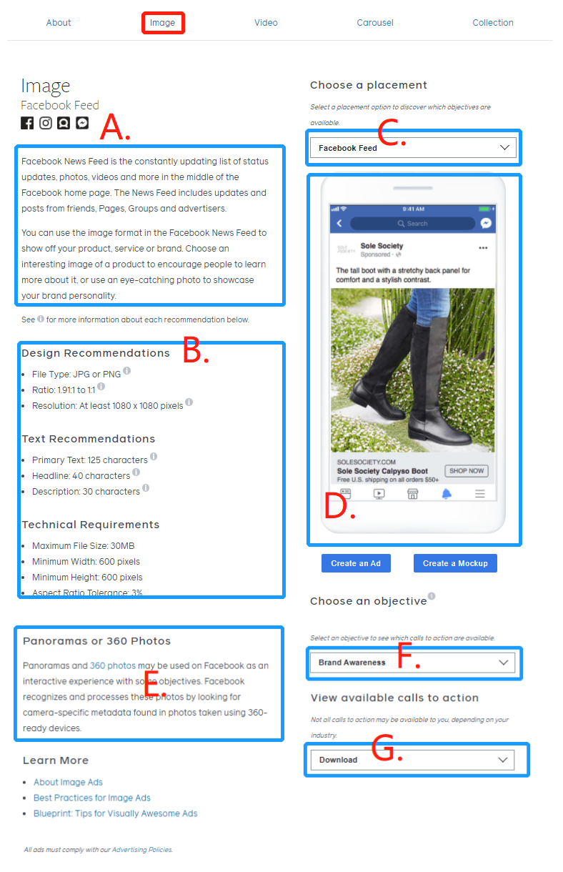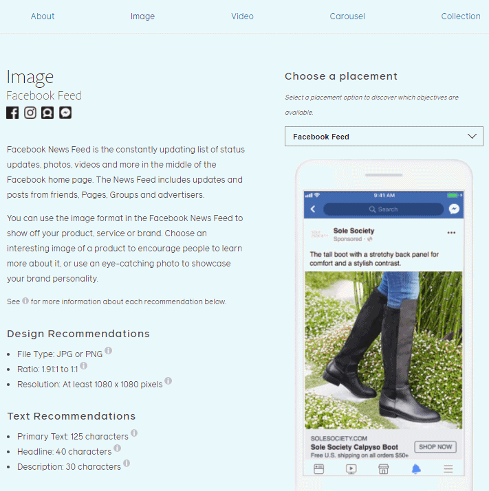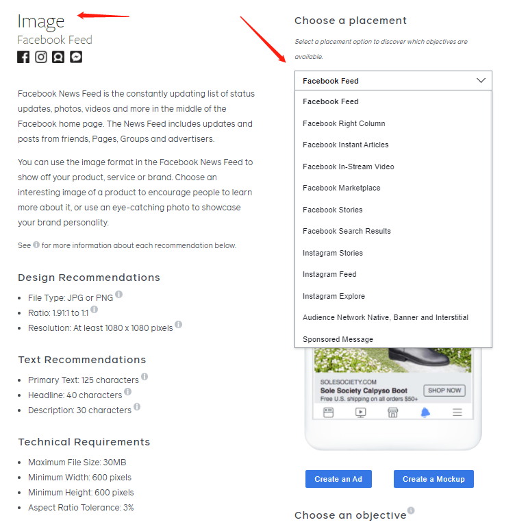 最直接的作用:帮助准广告主直观理解 Facebook 广告的几种形式和展示位置,以及有关尺寸、文件大小、字符限制等的最合适的推荐。