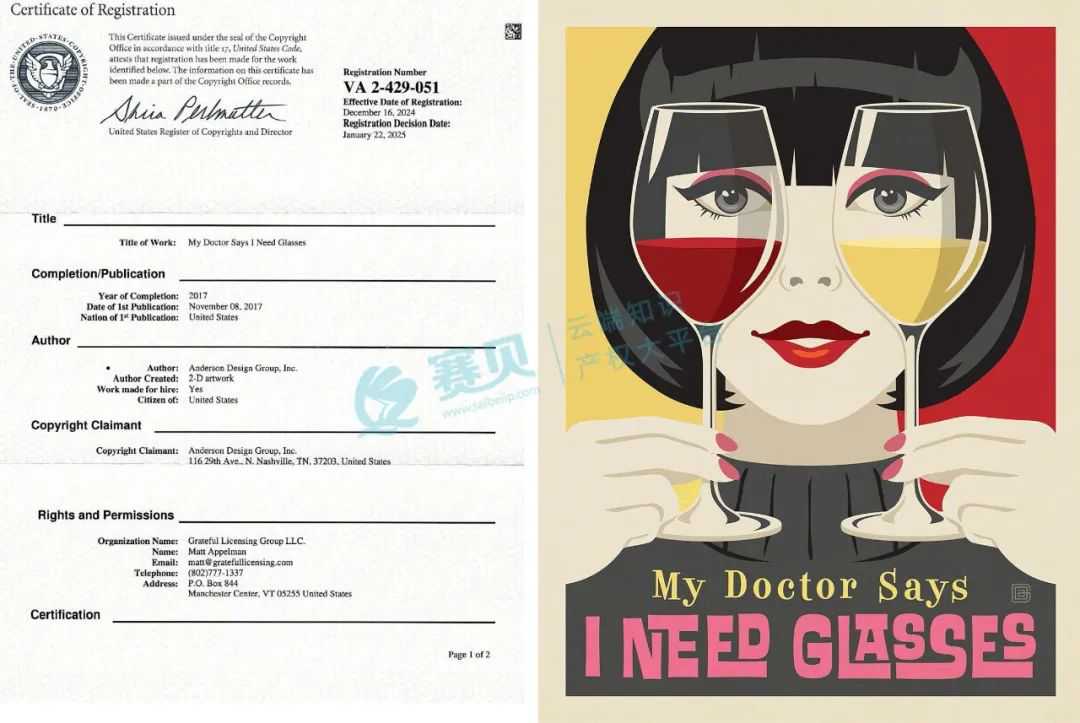 涉案的版权作品为《My Doctor Says I Need Glasses》(注册号 VA 2-429-051),该作品于2017年完成,并于同年11月1日在美国首次出版。这幅作品为典型复古波普风格,色彩大胆鲜明,以黄、红、黑等色块碰撞;人物形象简洁,短发、红唇显复古韵味;将酒杯与“需眼镜”概念结合。