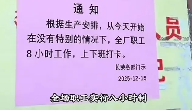 据工人透露,12月初,长荣玩具率先遣散了临时工。12月15日,工厂正式宣布实行无限期的“8小时”工作制,在惯常思维中这可能是劳动者权益保障的进步信号,但在代工厂的逻辑里,这往往意味着订单减少、生产萎缩。