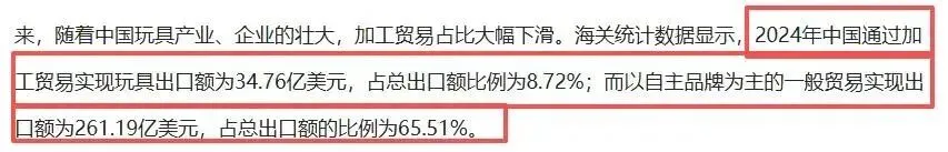 过去,在全球玩具产业链中,中国制造的地位相当关键,大概生产着全球约七成的玩具。但从数据来看,2024年开始,变化正在发生:2024年中国玩具出口中,以自主品牌为主的一般贸易出口占比已达65.51%,而传统代工(加工贸易)份额则萎缩至8.72%。