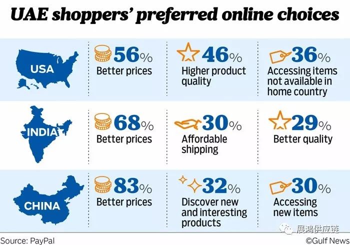 阿联酋购物者网购时有自己的选择习惯。“美国商品更注重信誉和质量,而印度是物流收益第二大的地区,”Dahan说。“而中国制造则以物美价廉吸引客户。”