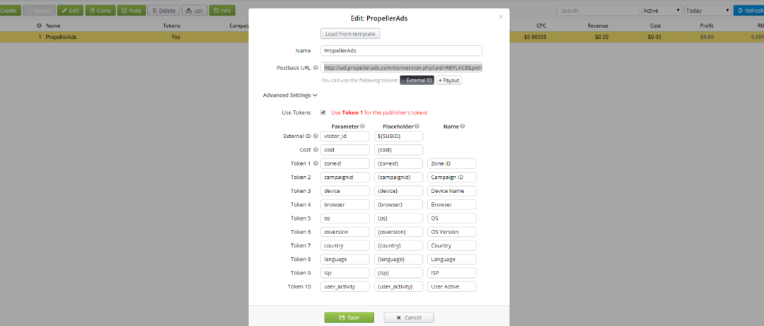 接着,先创建一个流量源,这里我用Propeller。只需要在load from template找到它,就可以保存了,如果你需要把数据回传到流量源,记得改为自己的Postback URL。