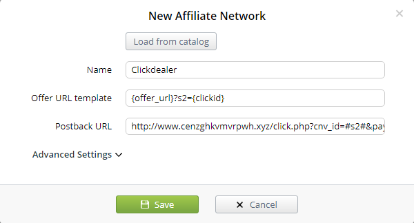 新增一个网盟,比如Clickdeler,同样是从Load from catalog模板里查看并保存。