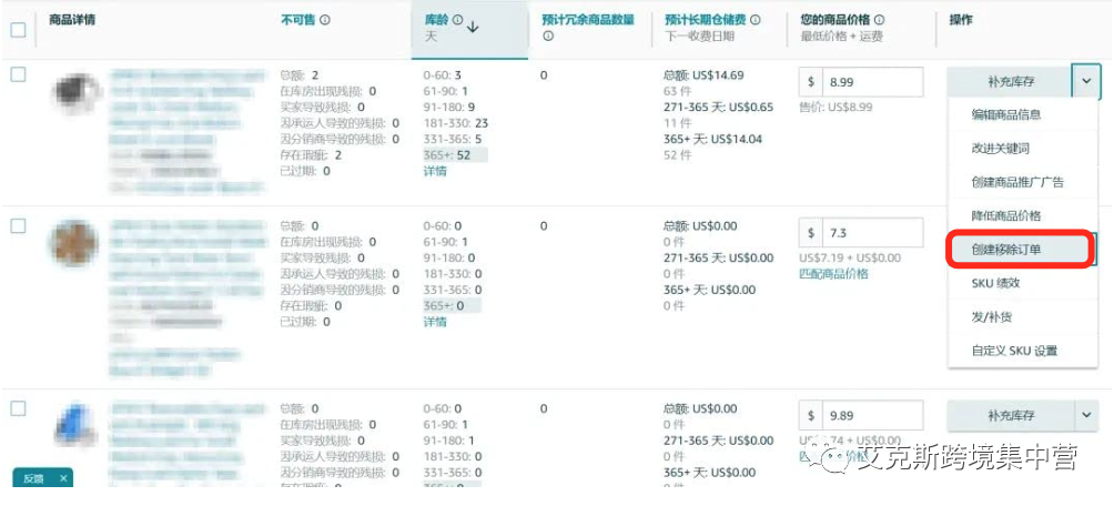 前往卖家平台,在【库存】-【库存规划】-【管理库存状况】页面和【修复无在售信息的亚马逊库存】页面,你都可以选择一个或多个需要移除库存的ASIN,对选定的商品“创建移除订单”。或者你也可以下载“建议移除报告”,查看亚马逊建议你移除的商品。