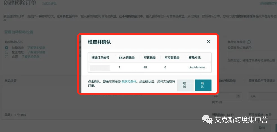 在“创建移除订单”页面中的“选择移除方式”模块下,选择“批量清货”,并填写要清货的商品数量(【可售数量】或【不可售数量】),然后点击“查看”,进入到订单检查页面。