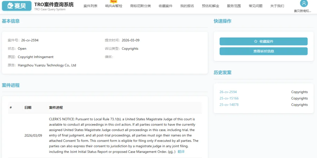 目前案件还未有重大进展,从案件进程截图中,已经关联到卖家去年至少已发过2个版权TRO维权。卖家可以在赛贝TRO案件查询系统免费下载诉状和跟进案件最新进度!(公众号菜单及赛贝知识产权官网均有入口)