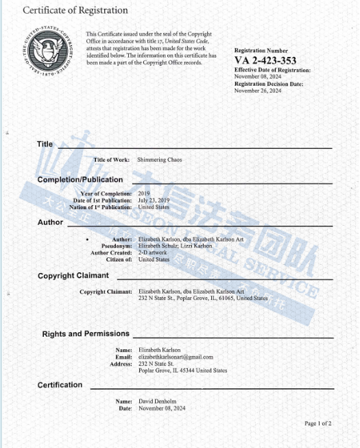 此案为版权维权,涉及2张圣诞版权图,版权号:VA 2-421-448、VA 2-421-728,值得注意的是,原告曾多次发案,官网已有两千多幅圣诞主题的版权画作,以下是涉及版权的具体信息,未经授权不得擅自使用,侵权风险极高,跨境卖家尽快检索下架,避免TRO侵权风险!