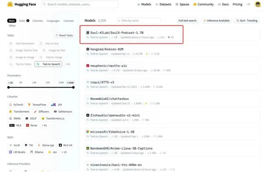 10 月 29 日,Soul 宣布推出 SoulX-Podcast 开源语音生成模型,该模型是由 Soul AI 团队与西北工业大学和上海交通大学共同开发,上线 1 天后,SoulX-Podcast 就登上了 Hugging Face TTS 趋势榜榜首。