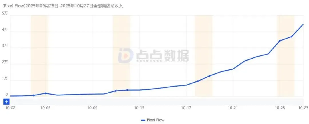 这款最近爬上榜单的混休新品名叫「Pixel Flow」。data.ai 的记录显示游戏在今年 8 月中旬上线,点点数据显示游戏的日流水从 10 月下旬开始逐渐增长,截至 10 月 27 日已经达到 4.4 万美元(iOS 和 Google Play 流水占比基本对等)。如果继续保持增长,月流水超过 100 万美元的可能性很大,目前游戏在美国 iOS 手游畅销榜的最高排名也达到第 166 位。对于上线才 2 个月的混休产品来说,已经算有了一定成绩。