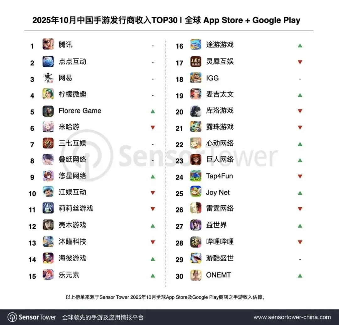 Sensor Tower 商店情报平台显示,2025 年 10 月共 32 个中国厂商入围全球手游发行商收入榜 TOP100,合计吸金 20.1 亿美元,占本期全球 TOP100 手游发行商收入 35.6%。
