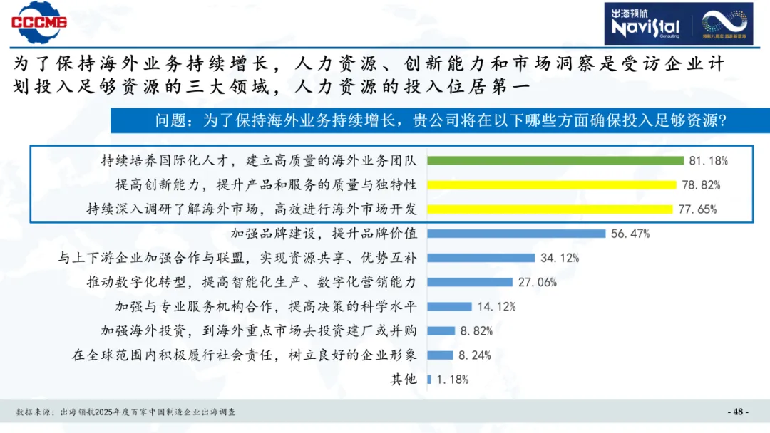 第一选项:超八成受访企业将“持续培养国际化人才,建设高质量的海外业务队伍”作为资源投入的第一选项,超过“提升产品质量服务”和“高效进行海外市场开发”等其他领域。