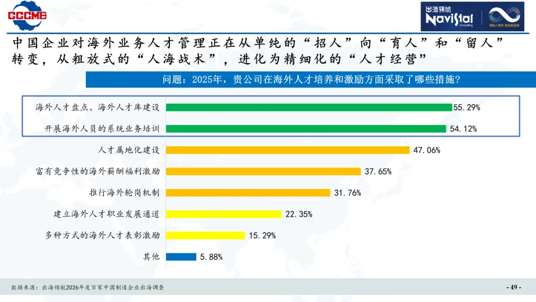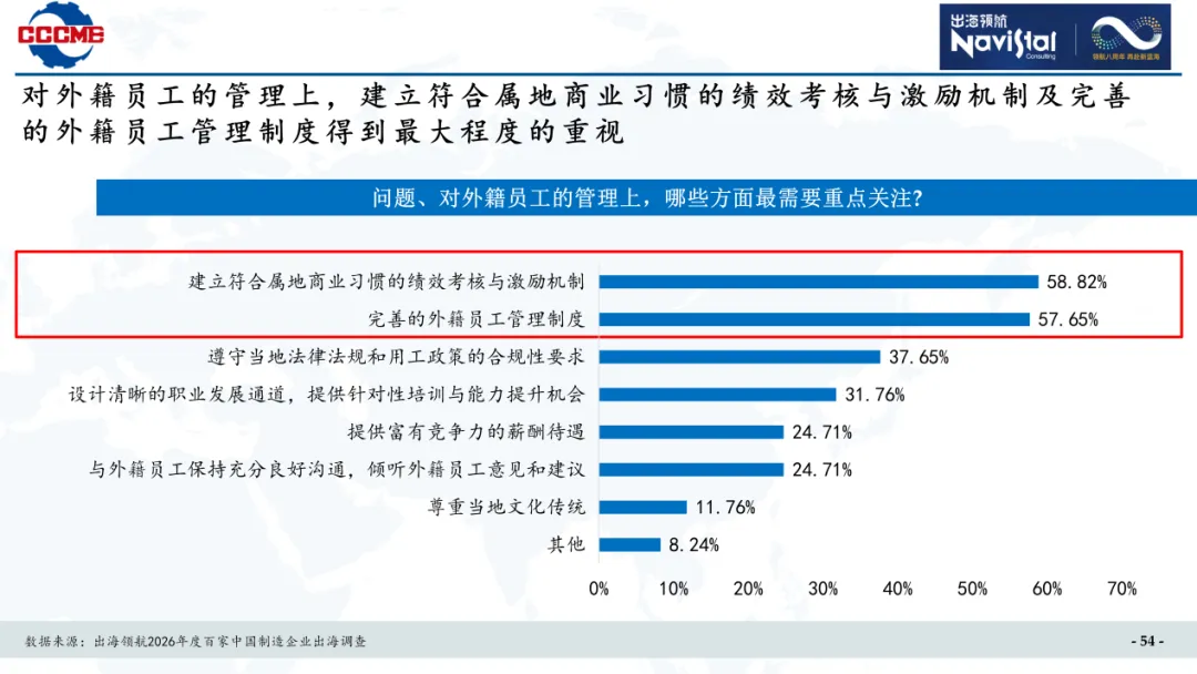 关注重点:外籍员工管理方面,企业最关注建立符合属地商业习惯的绩效考核与激励机制(58%)以及完善的外籍员工管理制度(57%)。这说明管理重点从“雇用”转向了“有效激励与管理”,追求管理的本地化适配。