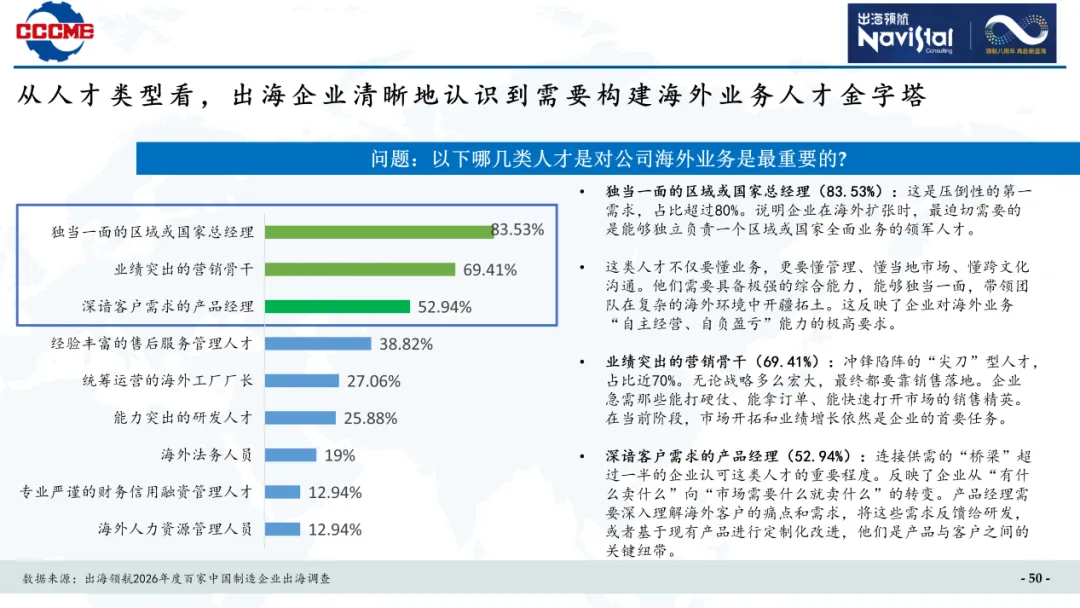 此外,海外工厂厂长、海外研发人员、海外法务人员、海外财务管理和海外人力资源管理等专业领域的管理者也得到了出海企业的越发重视,显示出在一体化、体系化出海的大势之下,企业需要的不仅仅是尖刀型的少数精锐人才,而是全方位、多兵种联合作战的出海铁军。