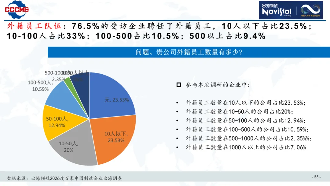 外籍员工:76.5%的受访企业已聘用外籍员工,表明招募聘用海外本地化员工为我所用已是普遍现象。