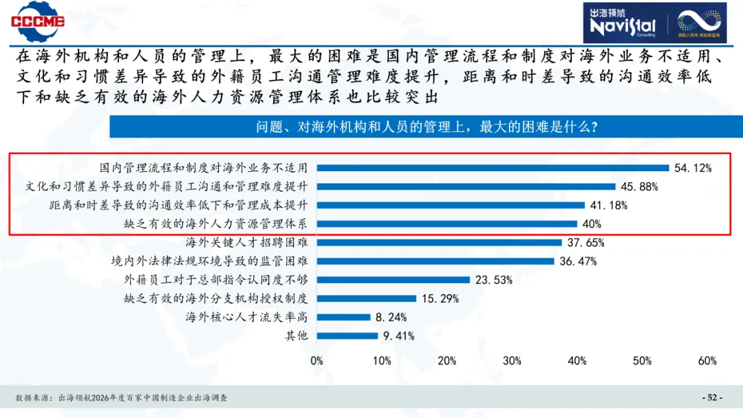 外籍管理:在海外机构和外籍人员的管理上,最大的三项困难是国内管理流程和制度对海外业务不适用(54%)、文化和习惯差异导致的外籍员工沟通管理难度(45%),物理距离和时差导致的沟通效率低下(41%)。