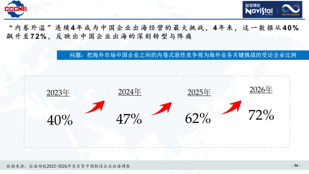 指数飙升:中国制造企业出海的“内卷外溢”现象连续4年成为中国企业出海经营的最大挑战。4年来,这一指数从40%飙升至72%,反映出中国企业出海的深刻转型与阵痛。