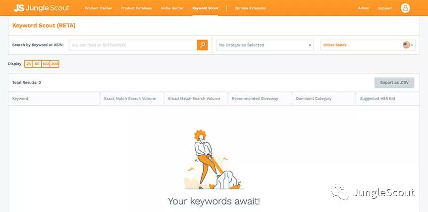 使用Jungle Scout Web App中最新的Keyword Scout 工具,你除了可以查看关键词搜索量,还可以掌握以下信息: