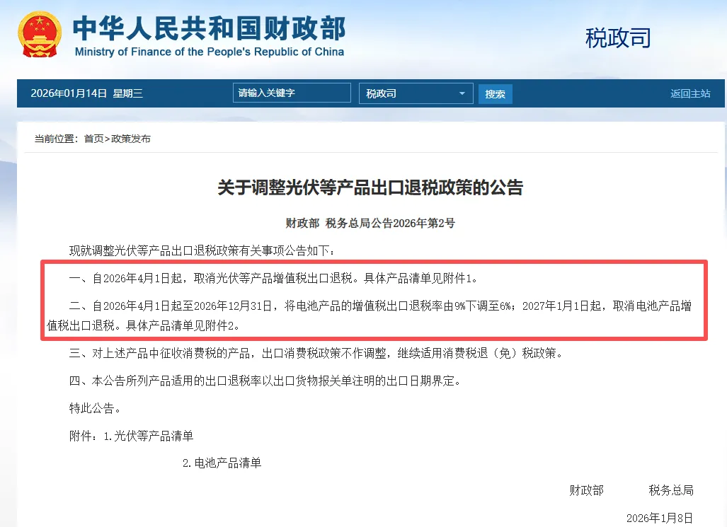 财政部、税务总局近日联合签发2026年第2号公告,对光伏、电池等多领域出口退税政策作出重大调整。