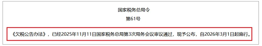根据该令的内容,目前《欠税公告办法》已审议通过,将于2026年3月1日起正式施行。