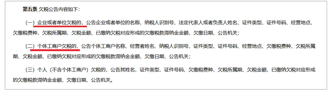 2、个体工商户欠税的,会公示个体工商户名称、经营者姓名、纳税人识别号、证件号码、经营地点、欠缴税费种、欠税所属期、欠税金额、已缴纳欠税对应形成的欠缴税款滞纳金金额、欠缴日期、公告机关。