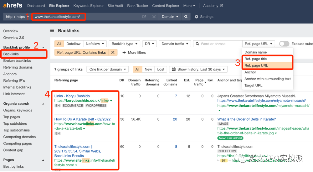分别选择Ref. page title / Ref. page URL,并搜索关键词如links, resources, best sites……