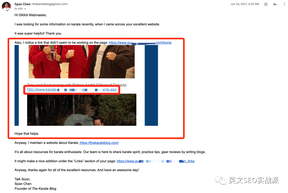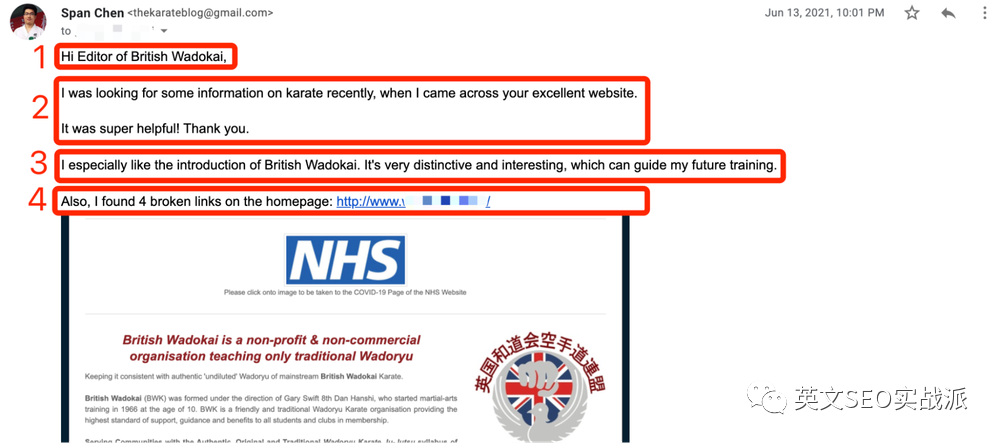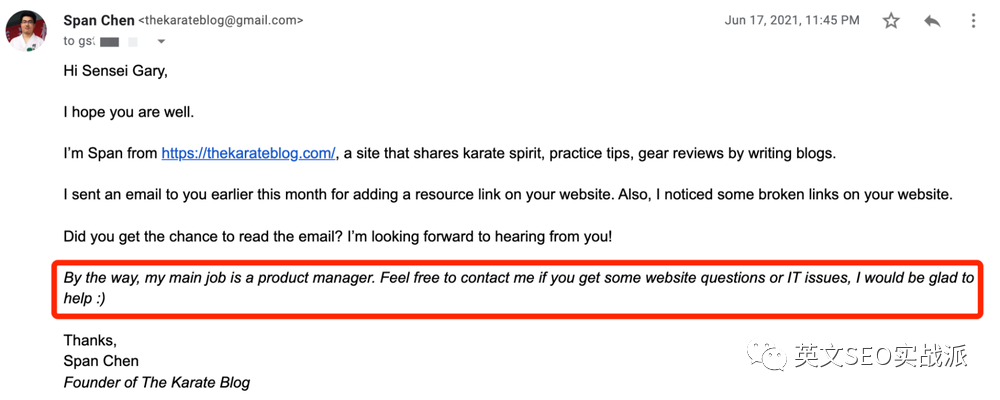 当我们希望得到别人帮助的时候,我们先给别人提供一些有用的东西,这样可以大幅提高Pitch成功率。去发现Prospectors的Broken Link就是一个很好的价值点,例如,我的Outreach邮件中就有这么一部分: