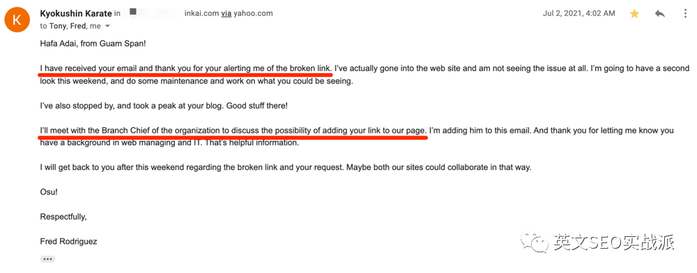 如果幸运,我们收到的回复就会是这样:对方对你提供的信息表示感谢,然后他们会乐意去帮你推进加外链的请求。