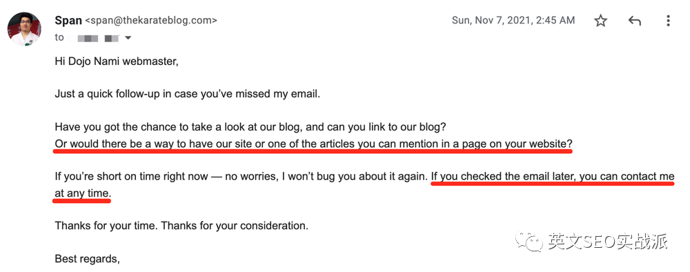 b、我们希望对方加链接,但我们的用词不要表现出有要求的意思,以此来提高用户接受度。关于这一点,有些人认为要直接表达出我们的请求,这样的邮件才会更有效,大家可以去做A/B测试,看看哪种效果好;
