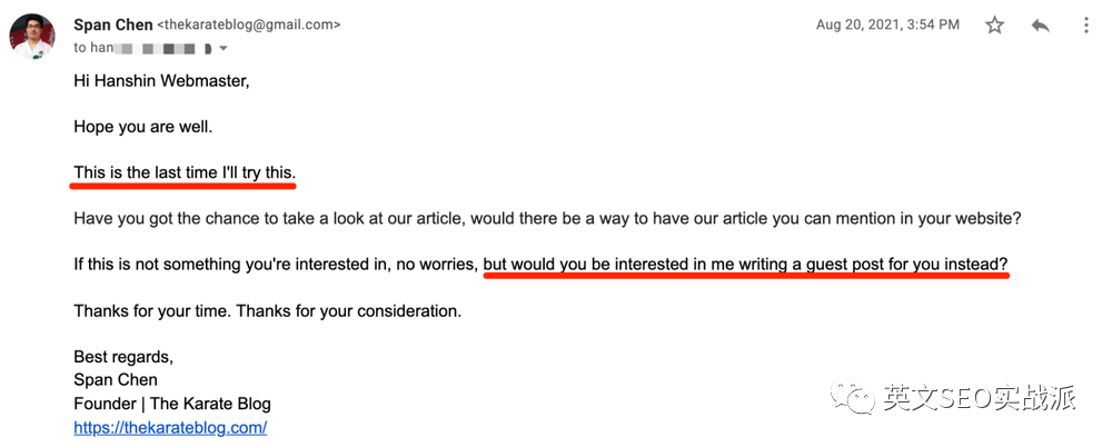 可能我们Outreach的人管理着多个网站,我们可以看看是否有机会获得其他网站的外链,比如,我就曾从签名中获取线索,通过同一个人一次获取2条外链。