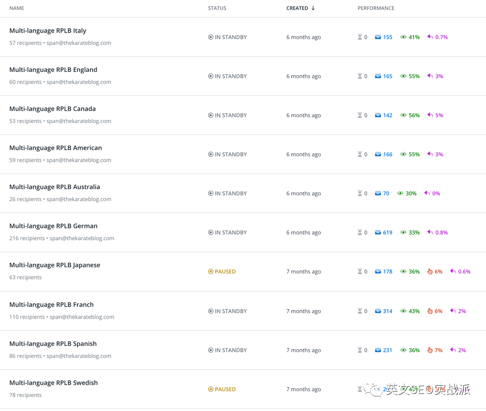 即使我们的主战场是美国,如果能获取一些其他国家网站的外链那也是有益无害,反正是同样的思路和方法,所以我选了一些国家操作了一番,部分邮件表现的数据供大家参考: