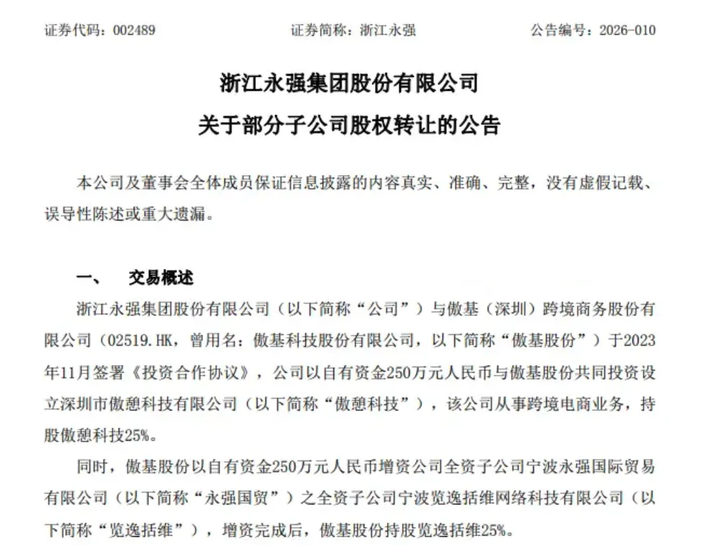 1月23日,浙江永强发布公告,确认与跨境大卖傲基股份中止跨境电商合作。双方通过互相转让子公司股权,彻底清空交叉持股关系。一句话概括这段合作的结局:故事很完整,结果很现实。
