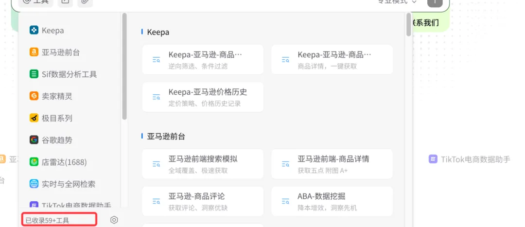 安装完成后,不是让你自己再去接各种外部工具、调API、配调用逻辑,而是已经预接入了59+ 个跨境电商相关工具 API,可以直接调用。API对应的工具有Keepa,亚马逊前台,SIF 数据分析工具,卖家精灵,Google Trends,1688/店雷达,侵权全网检索工具等等。这就很关键了。因为对卖家来说,配置这么多API就是一个很大的问题。但是没有API就根本没有办法发挥出Open Claw的作用。