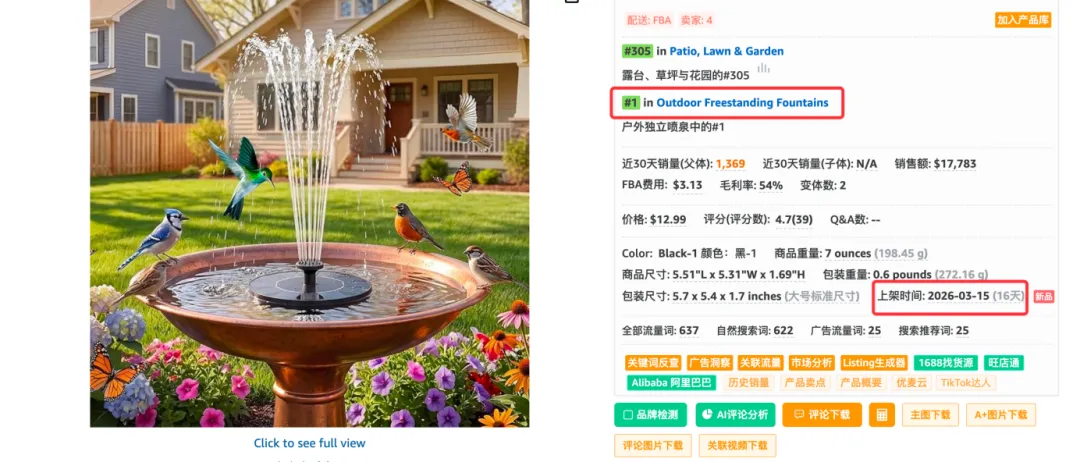 这是一个户外独立喷泉,发现它上架才十几天,订单已经冲到了1000+。这时候你想做的,不应该只是感叹一句这条链接起得真猛,而是要拆它到底怎么起的。