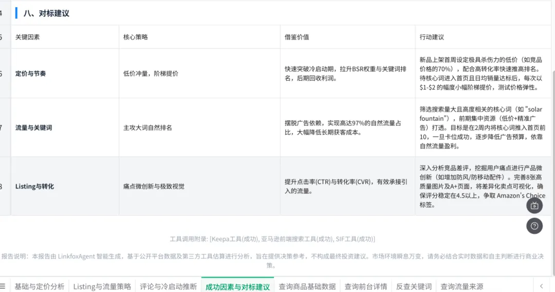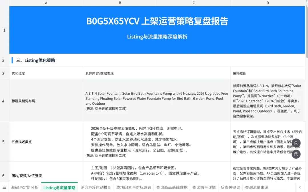 等待几分钟后,就可以看到详细的拆解报告。包括基础信息,定价分析,流量策略,评论分析,成功因素及对标建议,反查关键词,流量来源分析,真的特别详细。