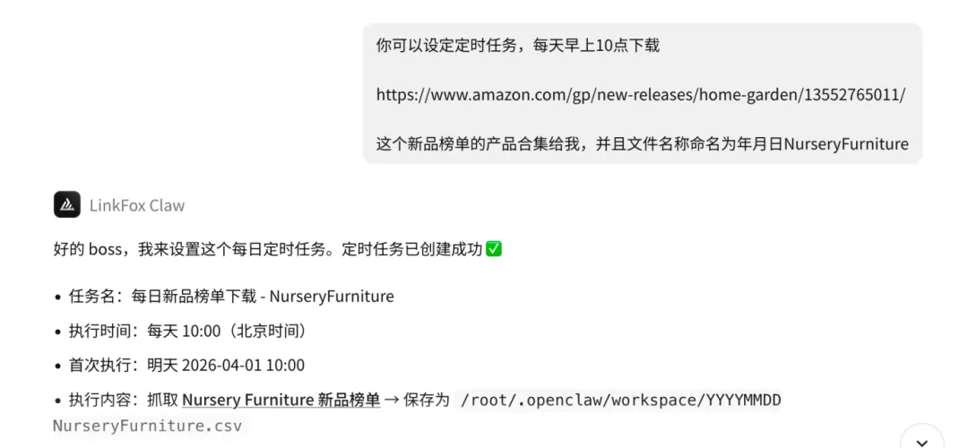 卖家都知道一个新品榜单变化是特别快的,但是很多工具都是能查询现在的榜单数据,1月1日的新品榜单有哪些产品,你知道吗?这时候就可以借助Linkfox Claw设置一个定时任务。