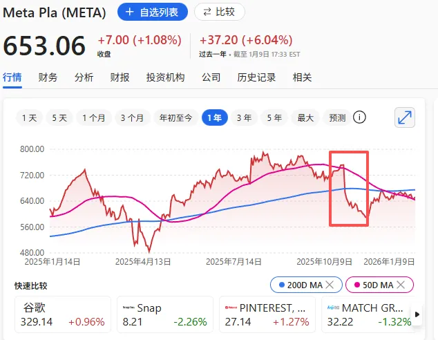 红框标注:10月30日Meta发布2025年第三季度财报后下跌