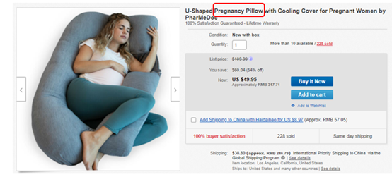 如果卖家朋友上架到网店的产品和Pregancy Pillow相同或相似,或者在产品描述中使用了“PregancyPillow”商标词,则可能构成侵权,如下面这位卖家: