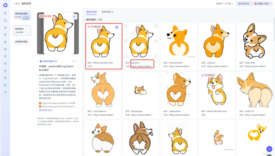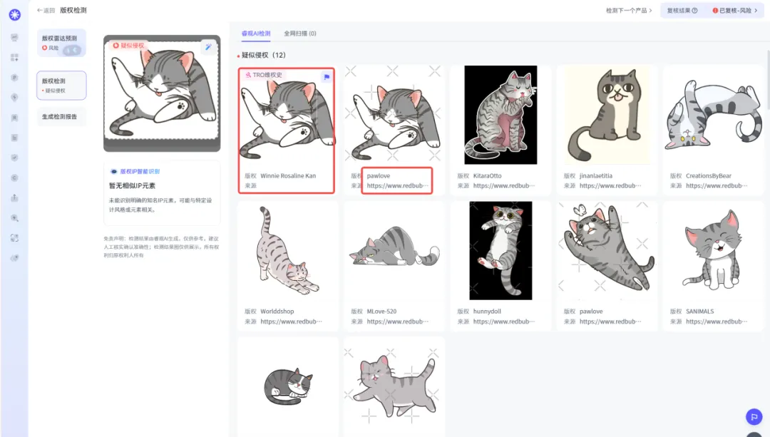 将此次发起维权的版权作品上传至睿观独家自研的版权检测功能后发现,该作品已有生效TRO维权史;并且睿观还发现该版权作者以pawlove为名仅在Redbubble平台上发布作品