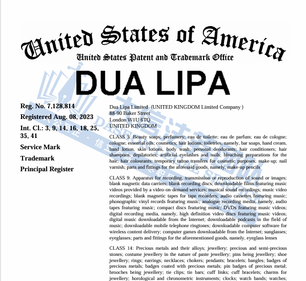此案为商标维权,主要针对Dua Lipa商标维权,涵盖香水、录音制品、纸制品、金属与珠宝、箱包、服饰、娱乐等多个类目。以下是涉及商标具体信息,未经授权不得擅自使用,侵权风险极高,跨境卖家尤其是服装卖家尽快检索下架,避免TRO侵权风险!