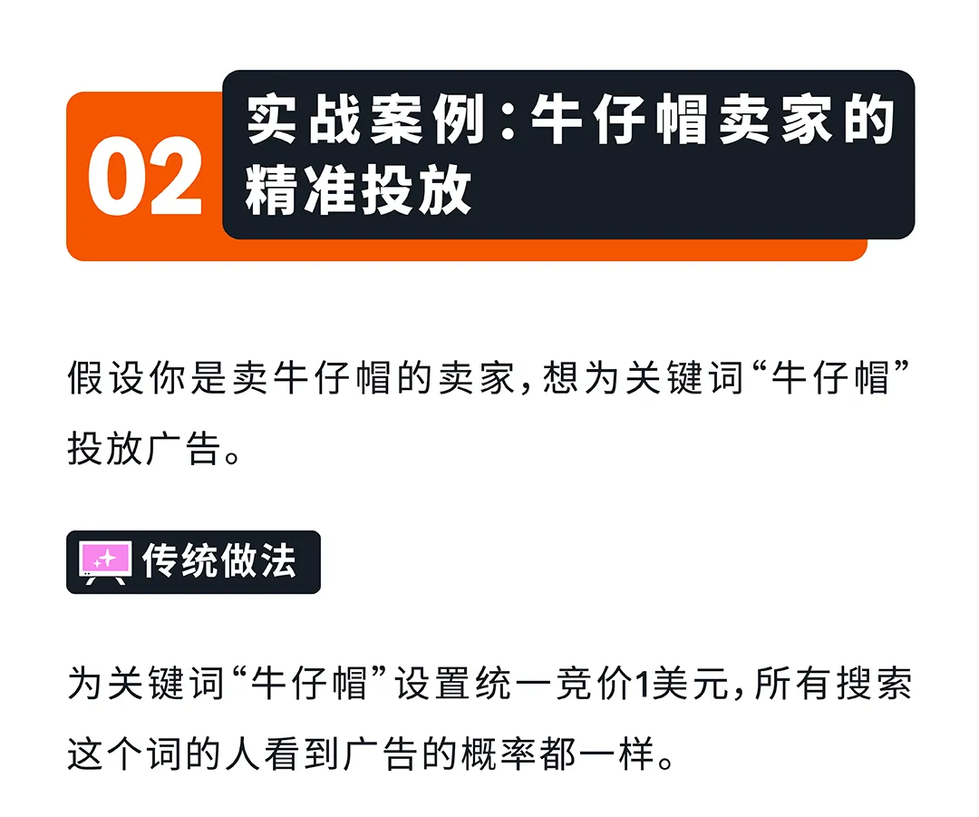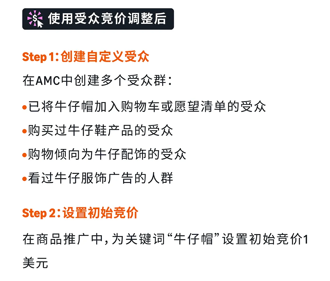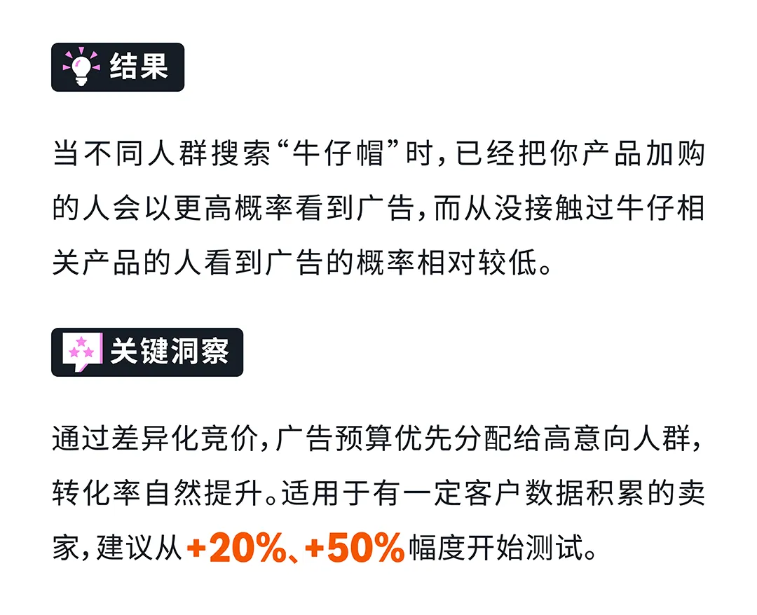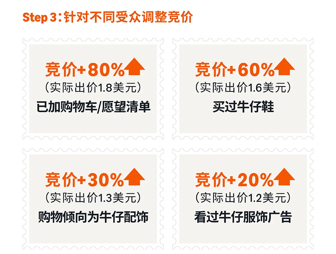 实战案例:牛仔帽卖家为关键词"牛仔帽"设置初始竞价1美元,针对不同受众调整竞价:已加购物车受众竞价+80%(实际1.8美元),买过牛仔鞋受众竞价+60%(实际1.6美元),购物倾向为牛仔配饰受众竞价+30%(实际1.3美元)。结果:已加购的人以更高概率看到广告,广告预算优先分配给高意向人群,转化率自然提升。