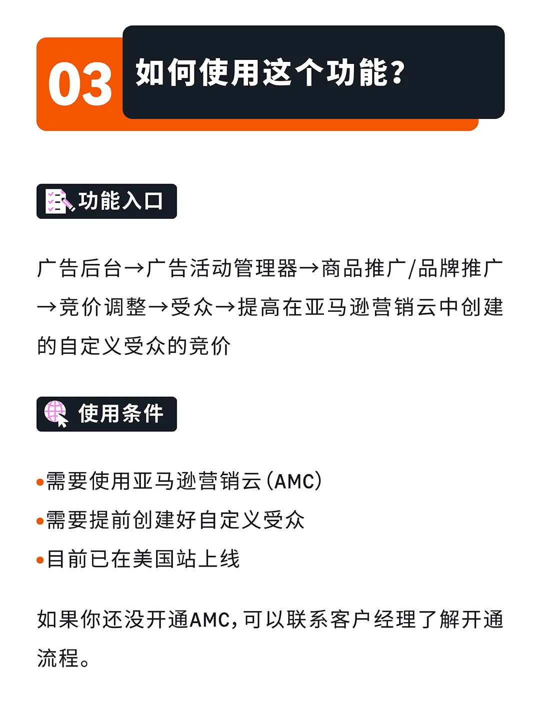 功能入口:广告后台→广告活动管理器→商品推广/品牌推广→竞价调整→受众。使用条件:需要使用AMC并提前创建好自定义受众,目前已在美国站上线。