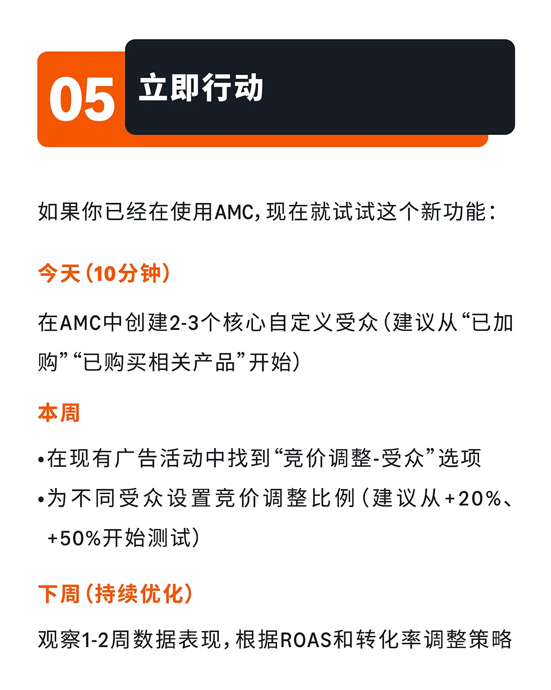 立即行动:在AMC中创建2-3个核心自定义受众,在广告活动中设置竞价调整比例(建议从+20%、+50%开始测试),观察1-2周数据表现并优化策略。精准投放的核心是把钱花在最有可能买的人身上。