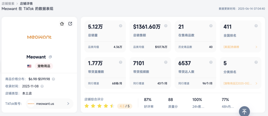 2025年5月,Meowant保持美国宠物用品销售榜TOP5,最近28天实现销售额$38.06万(其中$75以上高客单商品占比64.27%)。