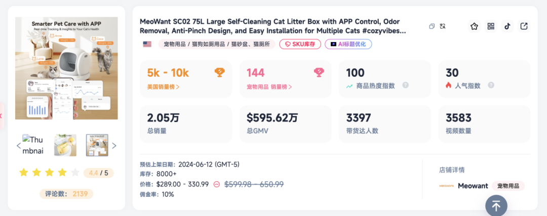 TikTok宠物爆品,售价300美元的猫砂盆单品卖出600万美元