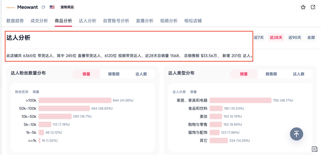 达人生态运营层面,品牌近28天新增合作201名垂类达人,其中76.16%的销量由达人内容驱动。