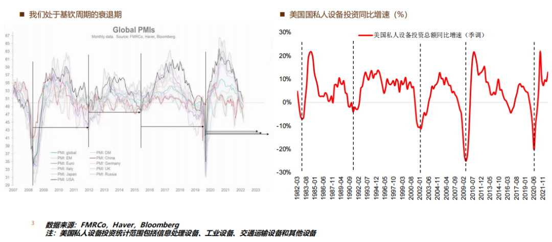 基钦周期,又被称为库存周期,即上方左边显示的图。根据历史情况,基钦周期一般为40到45个月。其中,扩张期平均是26个月,收缩期一般平均是17个月。基钦周期的衰退期或将持续到2023年下半年或者2024年年初,之后开启长达40-45个月的新一轮库存周期。