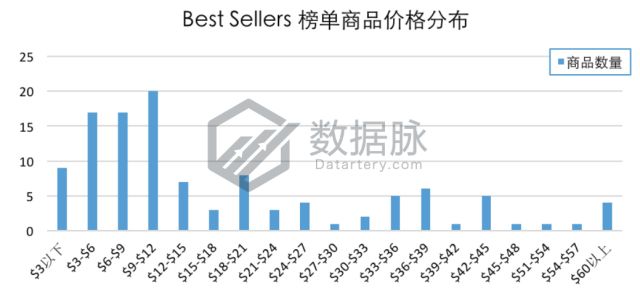 上周Office Products品类Best Sellers榜单商品最高价$90.0,最低价$0.09,平均价格$18.82。其中,价格分布于$9.00-$12.00区间内的上榜商品数最为突出,占比达15.63%;同时,定价在$3.00-$6.00与$6.00-$9.00两个价格区间的商品数各自占了上榜商品总数的13.28%。在高价格段,上周有4 款上榜商品价格超过了$60.00,占比3.13%。骆探长(shujumai.com)发现,相比该品类的上期分析,该周进榜Best Sellers榜单的商品平均价格出现了较为明显的抬升。