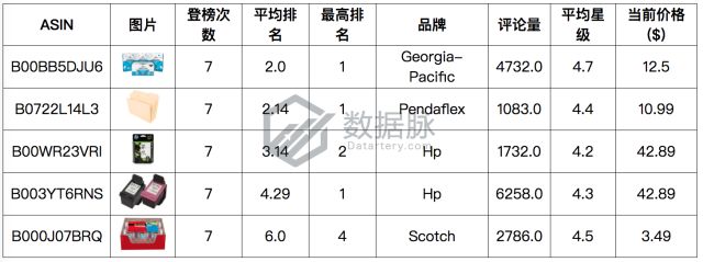 另外骆探长 (shujumai.com)发现,一款来自品牌Scotch的胶带套装也在上周多次跻身榜单前五,该商品目前的最新品定价为$3.49,成为了上周综合表现 前五的商品中定价最低的商品。